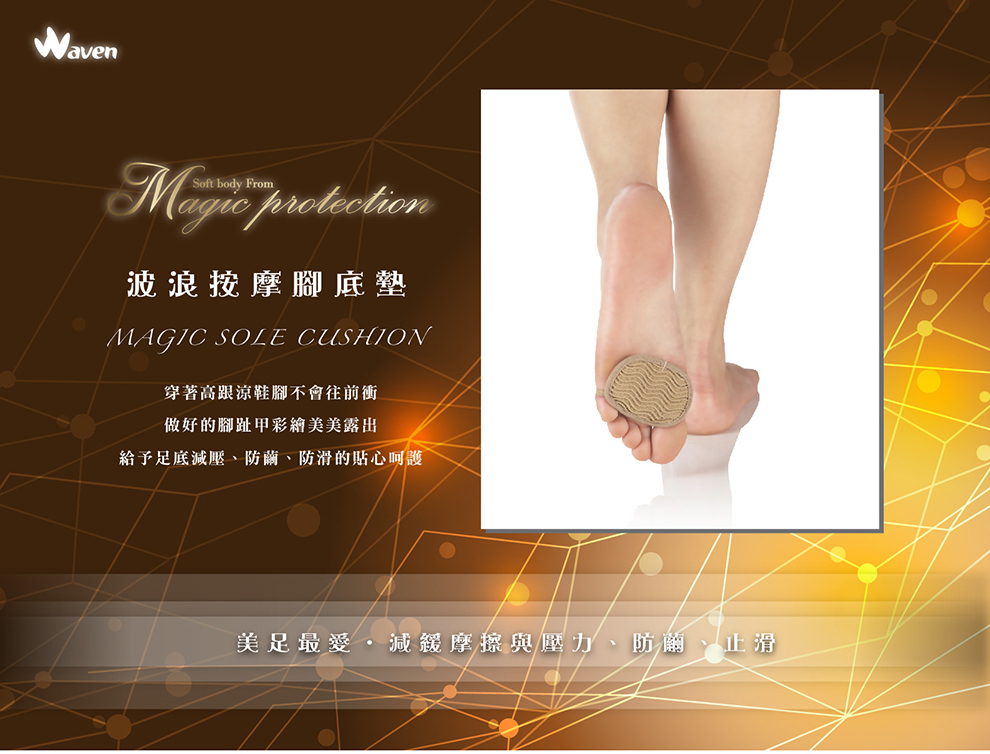 *3D波浪按摩織布,透過微細按摩作用,減少腳底蹠骨處與鞋面摩擦產生厚繭、舒緩足底壓力承受。