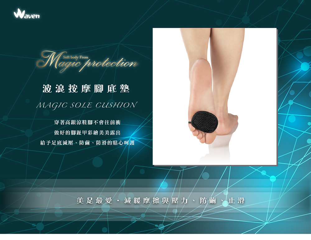 *3D波浪按摩織布,透過微細按摩作用,減少腳底蹠骨處與鞋面摩擦產生厚繭、舒緩足底壓力承受。
