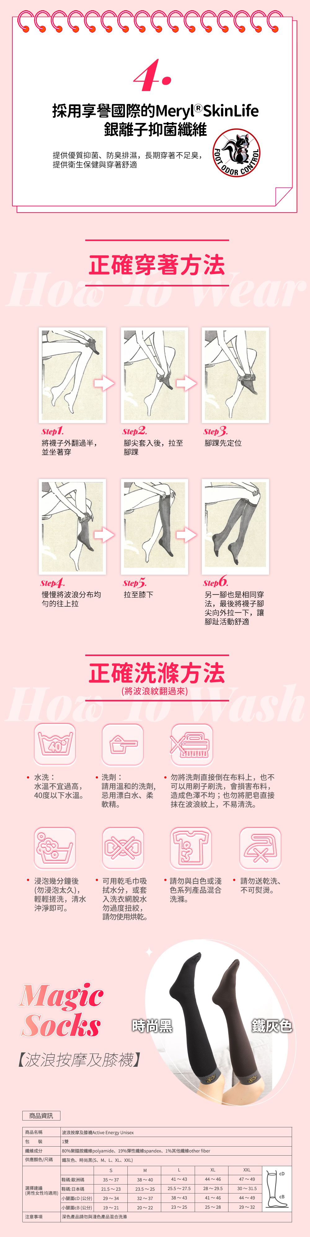 獨特波浪紋織法,彈性佳穿著舒適,不束腿、不滑脫,動、靜皆舒適輕鬆;並添加Meryl SkinlifE銀纖維,長時間穿著不足臭。